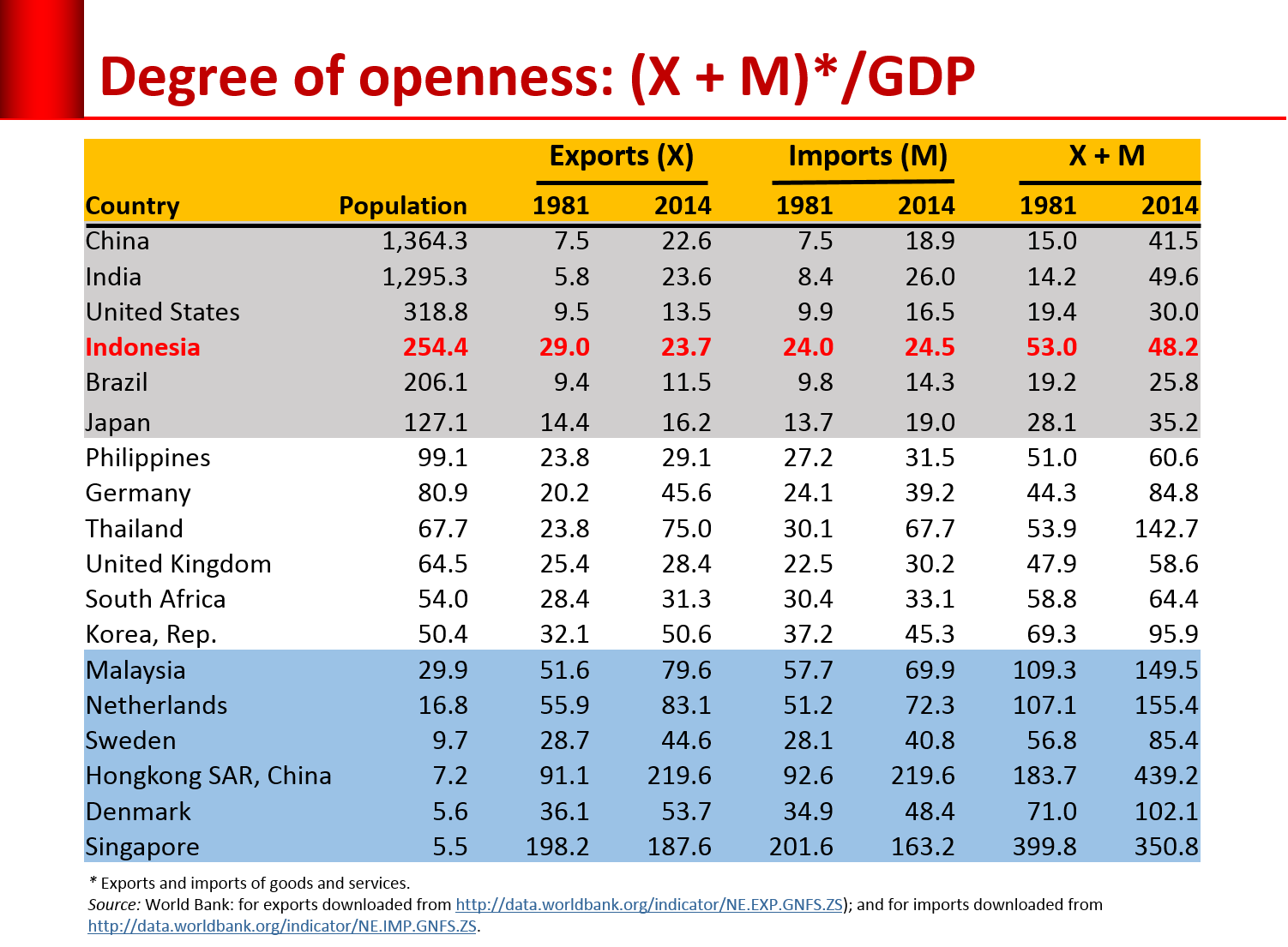 Kasus Indonesia bisa dikatakan ganjil karena hampir seluruh negara semakin terbuka dan kian terlibat dalam perdagangan internasional, tak peduli negara kapitalis ataupun negara sosialis, tak peduli negara yang berpenduduk banyak (di atas 100 juta jiwa), sedang (50-99 juta jiwa) ataupun sedikit (di bawah 50 juta jiwa). Singapura satu-satunya pengecualian namun sangat bisa dipahami karena tingkat keterbukaannya sangat ekstrem tinggi sebagaimana tercermin dari nisbah ekspor dan impor terhadap PDB yang mencapai 351 persen.