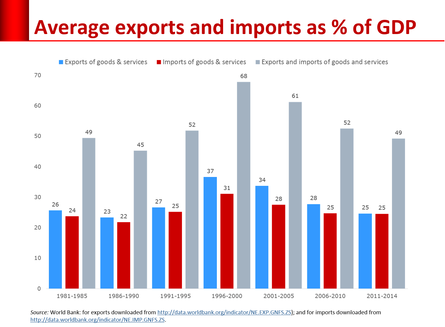 Peraga di bawah menunjukkan derajat keterbukaan (X + M) perekonomian Indonesia turun dari 53,0 persen tahun 1981 menjadi 48,2 persen tahun 2014. Penyebabnya ialah komponen ekspor (X) yang turun dari 29,0 persen menjadi 23,7 persen, sedangkan komponen impor (M) naik tipis dari 24,0 persen menjadi 24,5 persen.