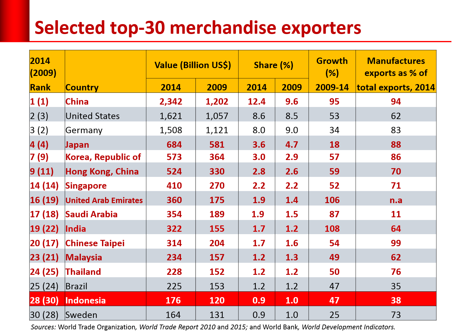 Sekalipun nilai ekspor Indonesia telah masuk kelompok top-30, pertumbuhannya relatif rendah dibandingkan negara di Asia (berwarna merah) kecuali Jepang. Pangsa ekspor Indonesia dalam keseluruhan ekspor dunia terkecil di antara seluruh negara Asia yang masuk top-30, yakni hanya 0,9 persen pada tahun 2014, turun dari 1,0 persen pada tahun 2009.