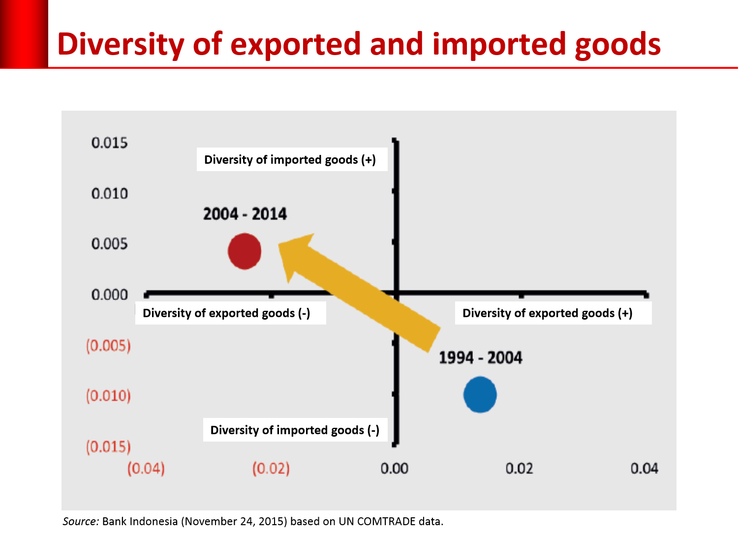 Dalam satu dekade terakhir, ekspor kita bukannya semakin beragam, malahan impor yang semakin meriah. Peraga di bawah menunjukkan selama periode 2004-2014 impor semakin beragam, sedangkan ekspor justru sebaliknya.