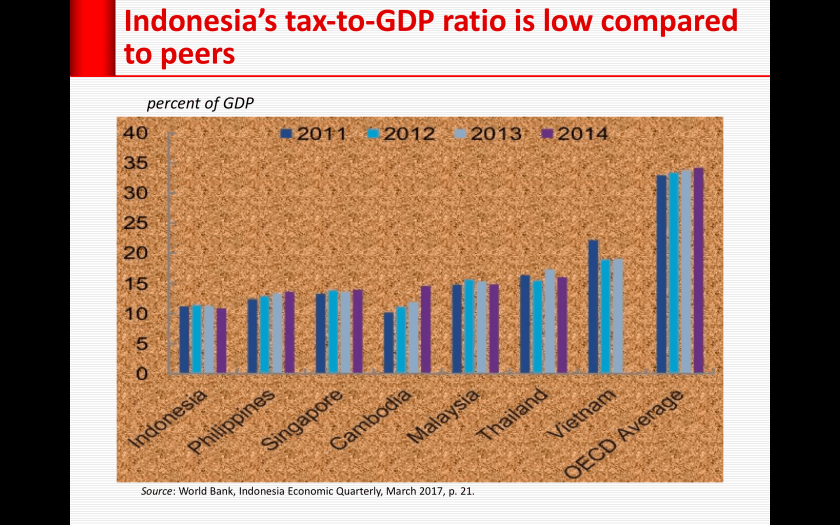 Berdasarkan LKPP, pada tahun 2017, penerimaan perpajakan mencapai Rp 1.343.5 triliun, sedangkan PDB harga berlaku sebesar Rp 13.588,8 triliun. Dengan demikian, nisbah pajak (penerimaan perpajakan dibagi PDB harga berlaku) adalah 9,9 persen. Data Kementerian Keuangan lebih tinggi, yaitu 10,7 persen.