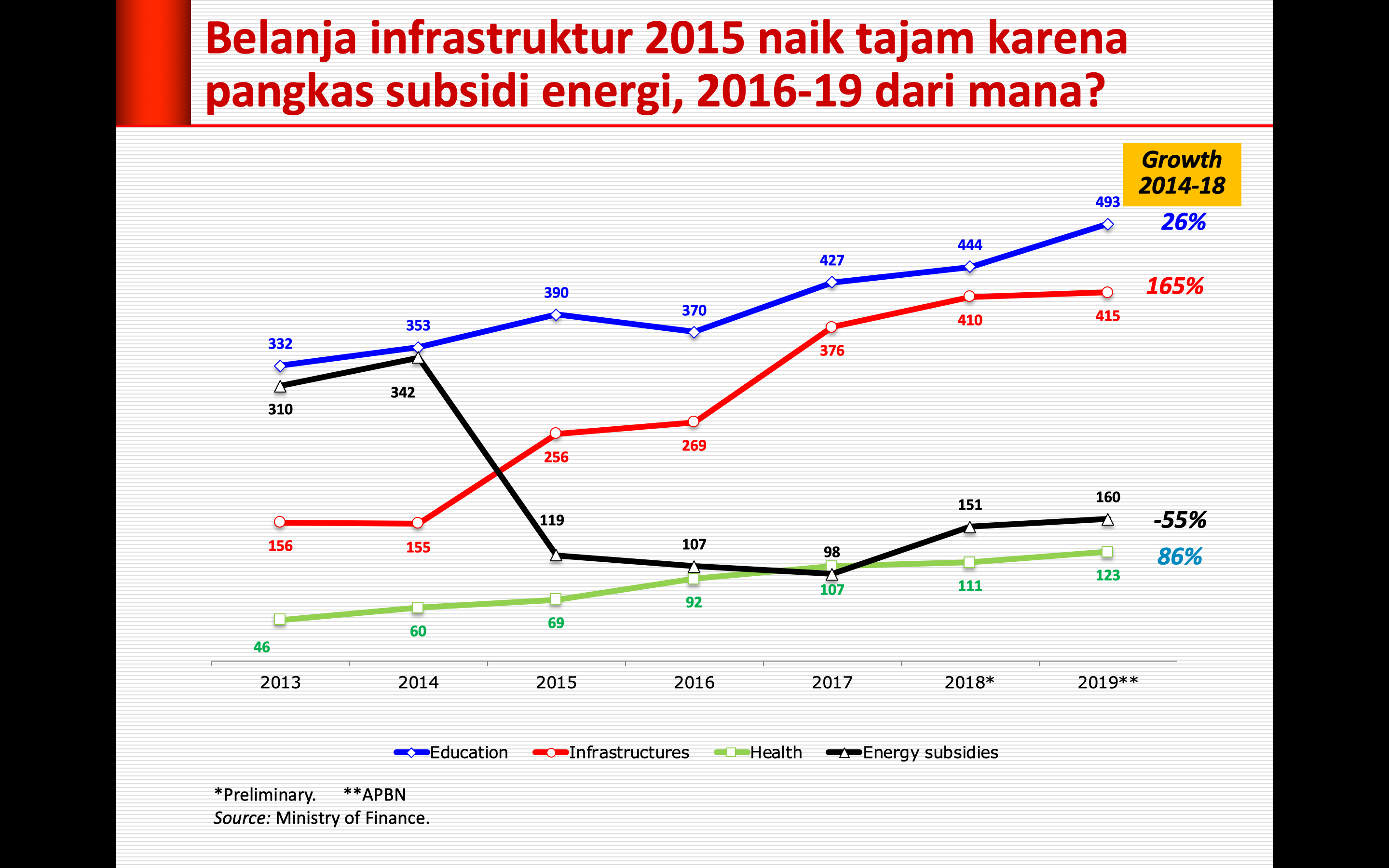 Pembangunan infrastruktur ekonomi yang dilakukan melalui belanja K/L dan belanja non-K/L ternyata justru cenderung turun. Yang membuat belanja infrastruktur melonjak adalah yang melalui transfer ke daerah dan dana desa, jadi bukan pos belanja pemerintah pusat. Alokasi dana transfer ke daerah dan dana desa untuk infrastruktur bersifat perkiraan sejalan dengan semangat otonomi daerah.
