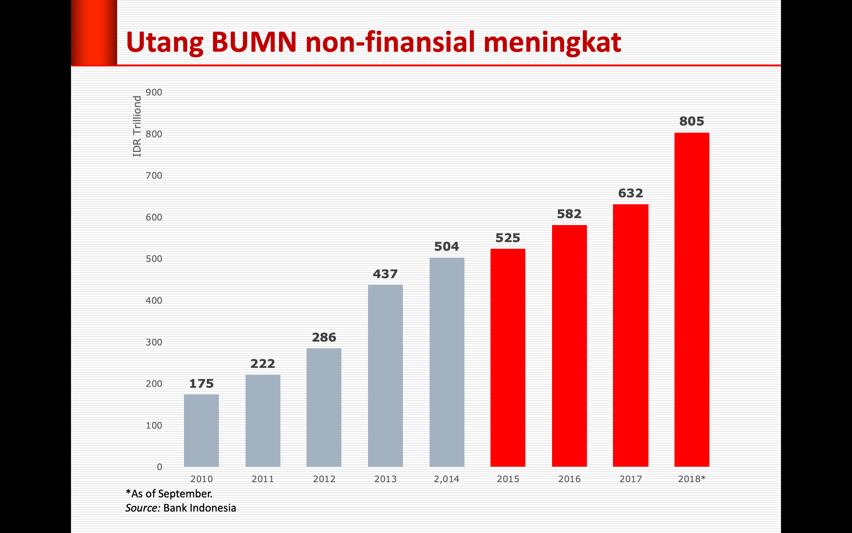 Mengingat penugasan yang massif di satu pihak dan keterbatasan kemampuan BUMN, maka BUMN terpaksa berutang. Selama kurun waktu 2014-2018, utang BUMN sektor nonkeuangan naik 60 persen, dari Rp 504 triliun menjadi Rp 805 triliun.