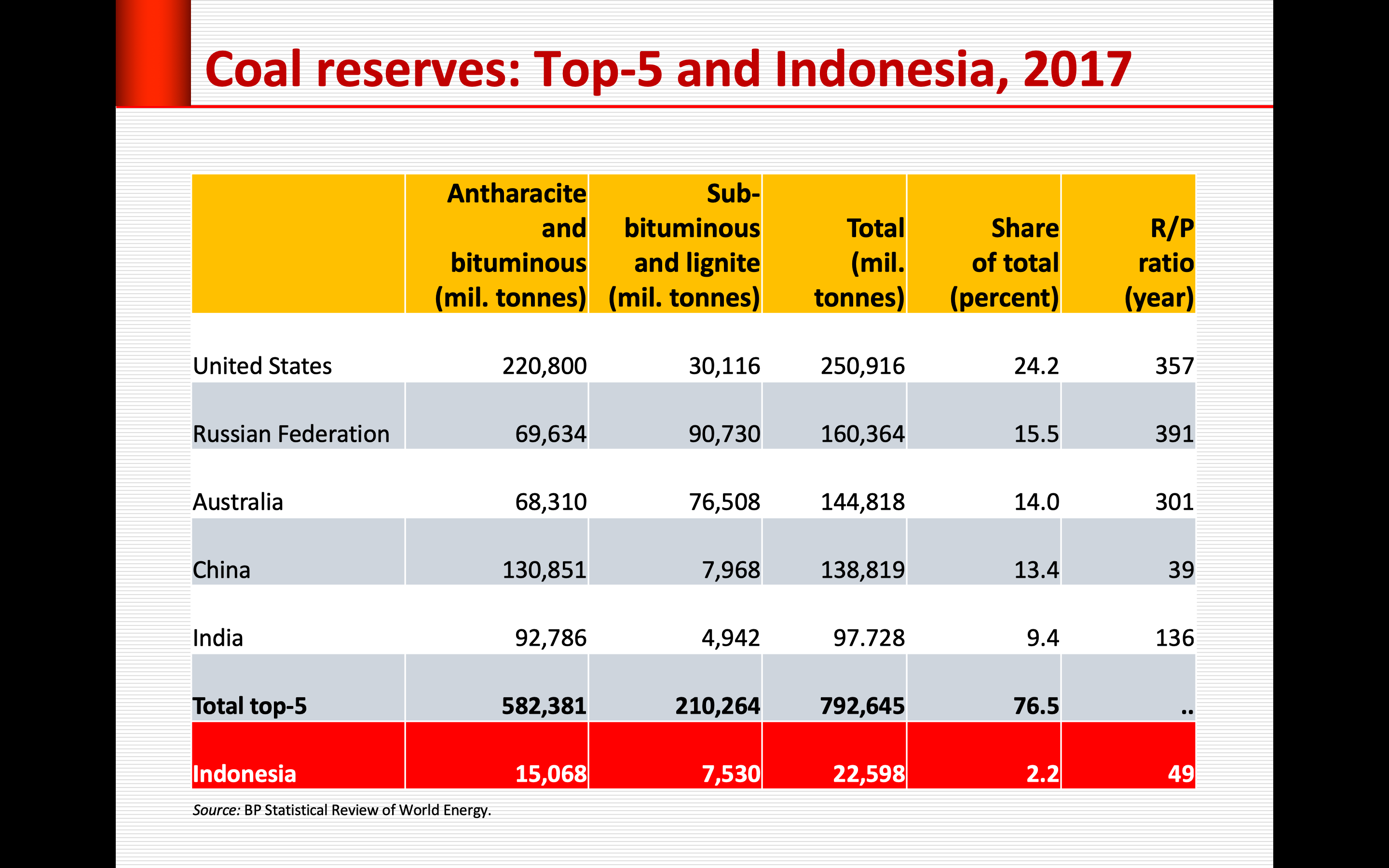 Cadangan batu bara kita hanya 2,2 persen dari cadangan batu bara dunia. Jika tingkat produksi seperti sekarang dan tidak ditemukan cadangan baru, cadangan batu bara kita akan habis dalam 49 tahun. Dengan asumsi yang sama, cadangan batu bara Amerika Serikat, Rusia, dan Australia yang merupakan top-3 dalam hal cadangan, akan habis dalam waktu 300 tahun lebih. Pemilik cadangan terbesar keempat, China, akan habis lebih cepat dari Indonesia.