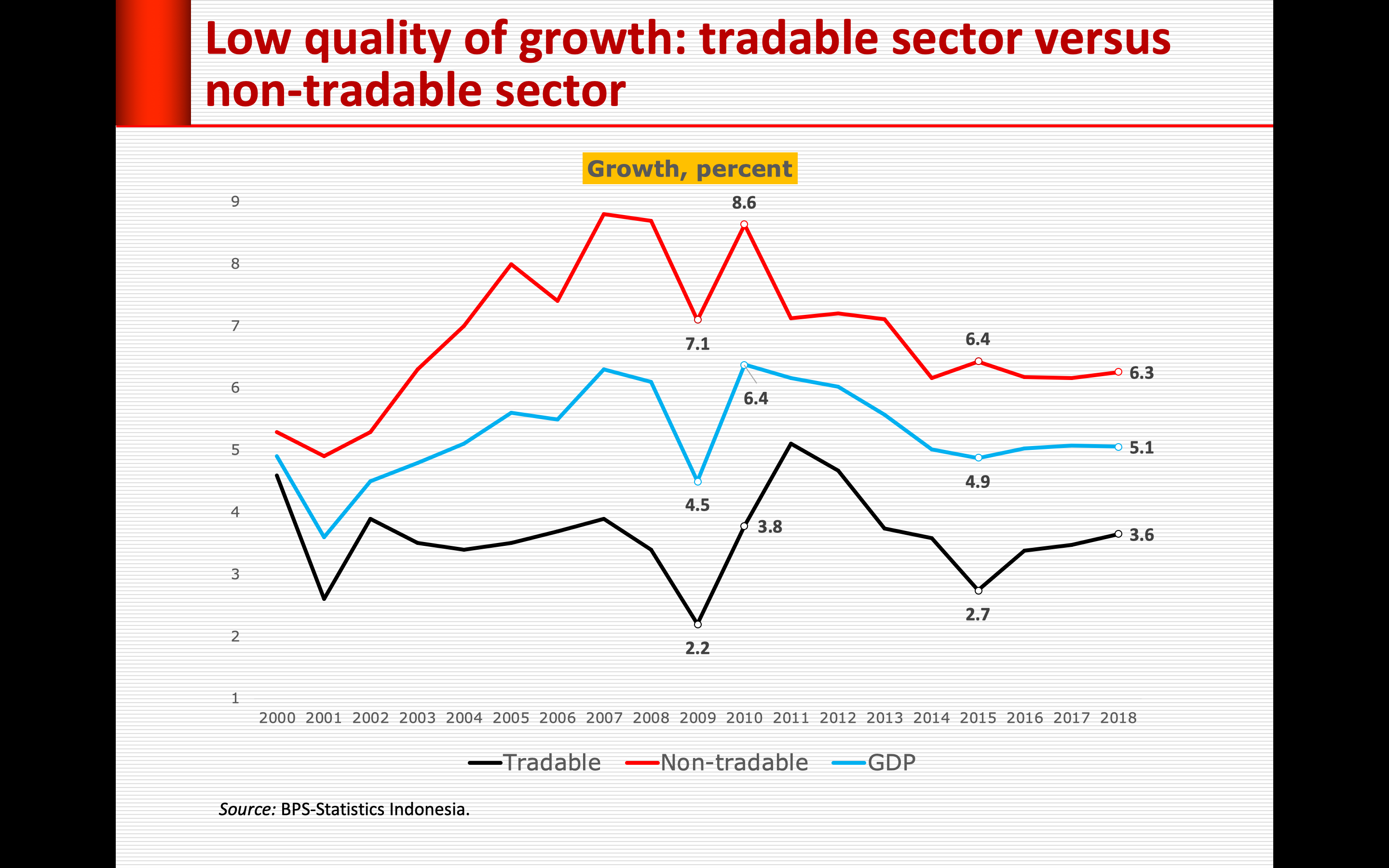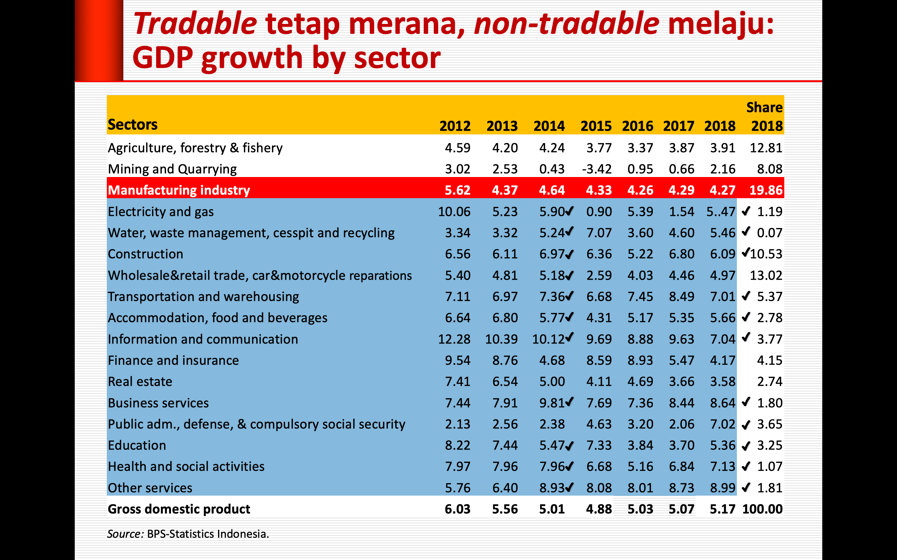 Sebaliknya, ketiga sektor penghasil barang (tradable) tumbuh lebih rendah dari pertumbuhan ekonomi. Sektor industri manufaktur yang merupakan penyumbang terbesar bagi PDB terus melanjutnya penurunan perannya, dari 20,52 persen pada 2016 menjadi 20,16 persen pada 2017 dan turun lagi ke aras di bawah 20 persen tahun 2018.