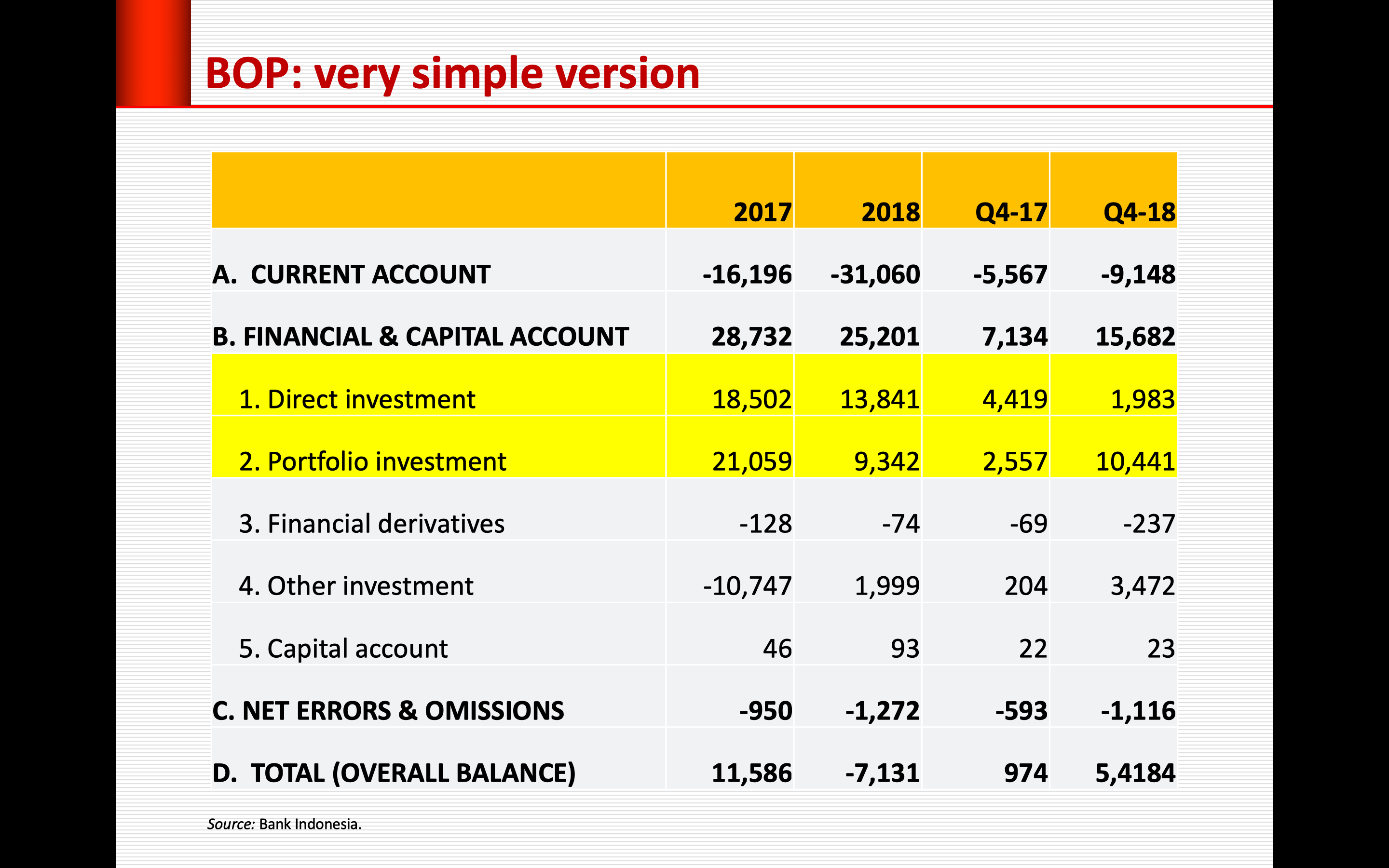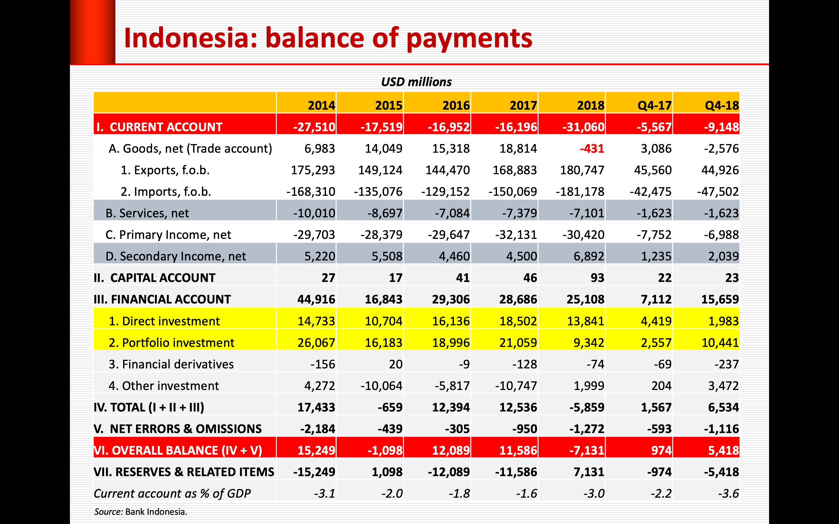 Keadaan berbalik pada 2018. Neraca pembayaran mengalami tekanan berat. Di satu pihak, defisit akun lancar melonjak hampir dua kali lipat. Di lain pihak, arus modal masuk melorot hingga lebih kecil dari defisit akun lancar, sehingga menyebabkan defisit neraca pembayaran. Kemerosotan arus modal masuk terjadi baik berupa modal asing langsung maupun modal asing dalam bentuk portofolio.