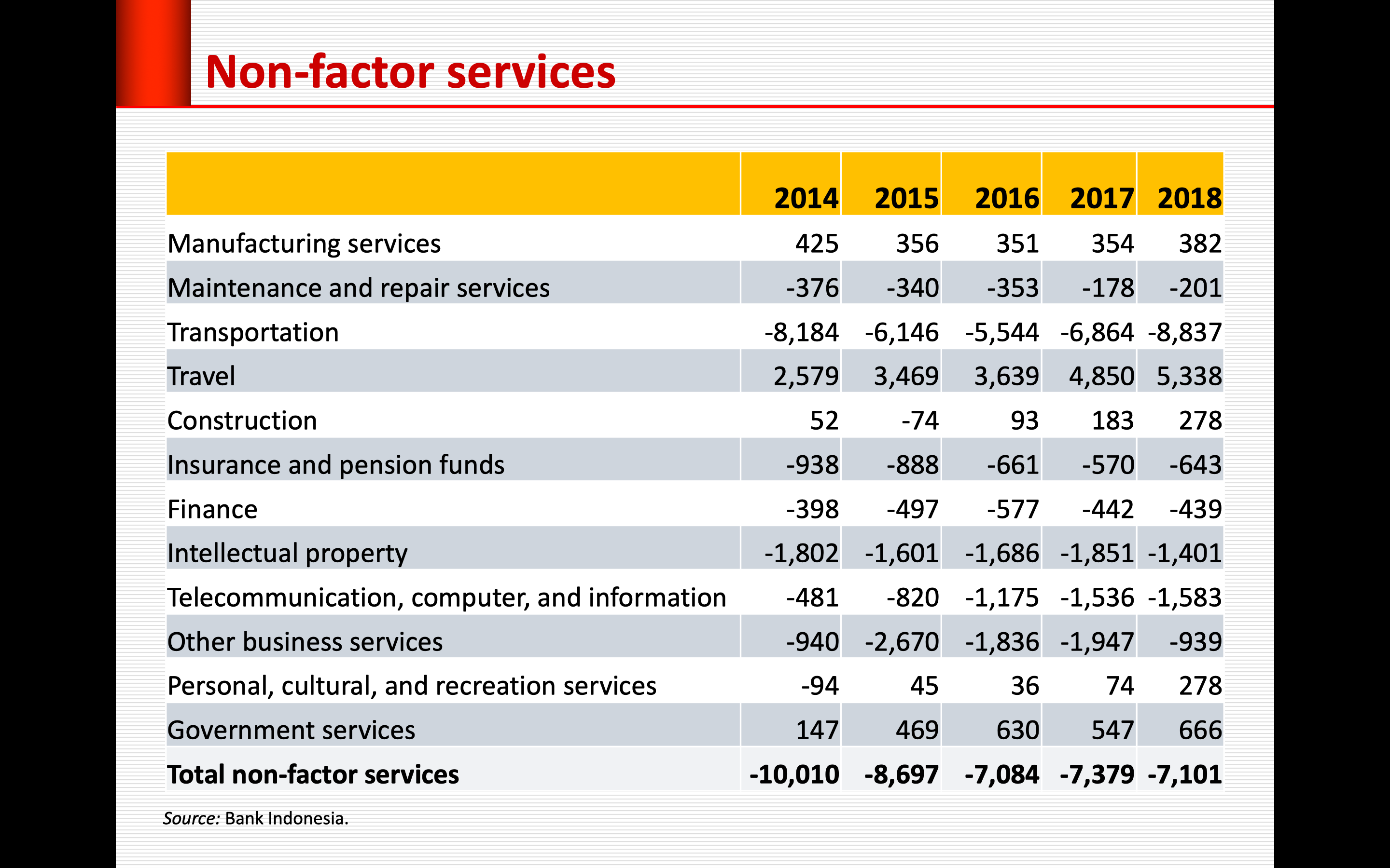 Komponen kedua dari current account adalah jasa nonfaktor, yaitu jasa-jasa yang bukan merupakan faktor produksi. Sepanjang masa komponen ini selalu defisit. Penyumbang defisit terbesar adalah jasa transportasi, terutama angkutan laut. Tahun 2018 Defisit jasa transportasi meningkat relatif tajam sejalan dengan peningkatan impor dan ekspor, mengingat hampir seluruh angkutan barang ekspor dan impor lewat laut dilakukan oleh perusahaan pelayaran asing.