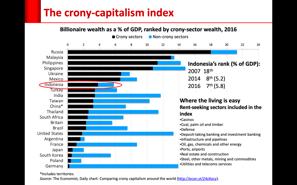 Sekitar dua pertiga kekayaan dari orang terkaya di Indonesia berasal dari sektor kroni (crony sectors). Indeks crony capitalism Indonesia berada di urutan ke-7 terburuk di dunia. Peringkat Indonesia terus memburuk, dari urutan ke-18 pada 20107 menjadi ke-8 pada 2014 dan ke-7 pada 2016.