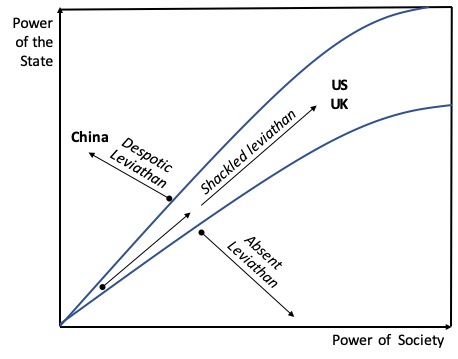 Tak pelak lagi, pendulum pada peraga di atas berayun ke kiri yang bias ke pengokohan cengkeraman power of the state, sebaliknya power of society cenderung melemah. Garis melengkung atas akan bergeser ke kiri mendekat ke sumbu vertikal. Dengan demikian koridor antara dua garis lengkung melebar, membuat kemampuan bermanuver power of the state kian leluasa.