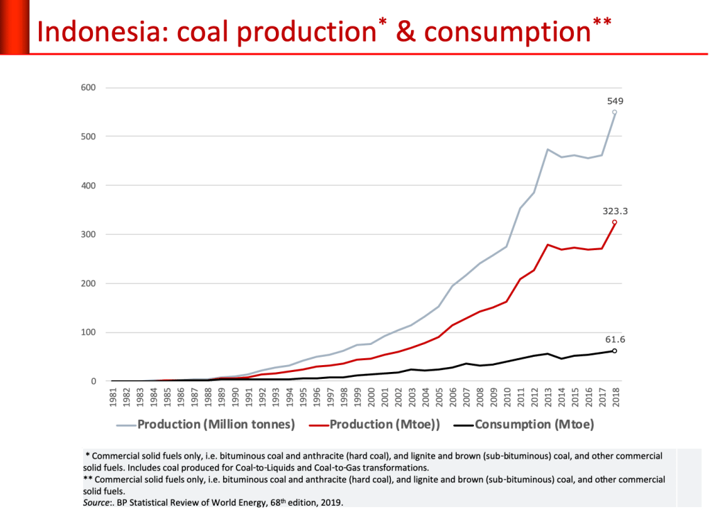 Bisnis batu bara memang sangat menggiurkan. Pada tahun 2018, produksi batu bara mencapai 549 juta ton. Setahun kemudian kembali lebih tinggi dan sekaligus melampaui target yang telah direvisi sekalipun, dari 489,73 juta ton pada awal tahun 2019 menjadi 530 juta ton pada pertengahan tahun 2019. Angka realisasi produksi 2019 sebesar 566 juta ton kemungkinan besar belih tinggi mengingat itu adalah angka sementara. Maklumlah, 2019 adalah tahun pemilu.