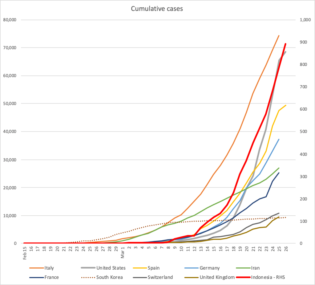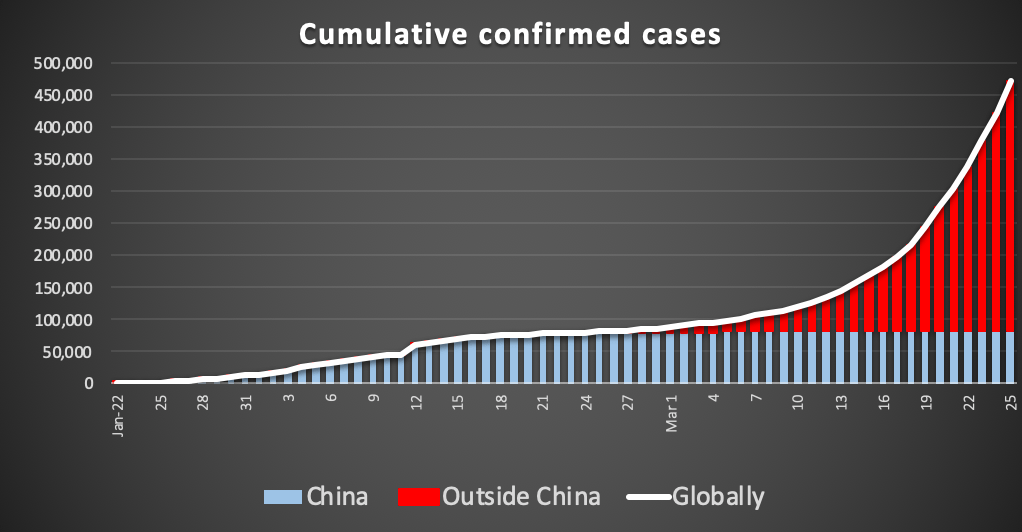 2. Per 26 Maret pk.17:15 (10:12 GMT), jumlah terjangkit di seluruh dunia sudah mendekati setengah juta orang dan jumlah kematian melampaui 20.000 jiwa. Lebih dari 70 persen yang terjangkit dan 85 persen yang meninggal dunia berada di luar China.
