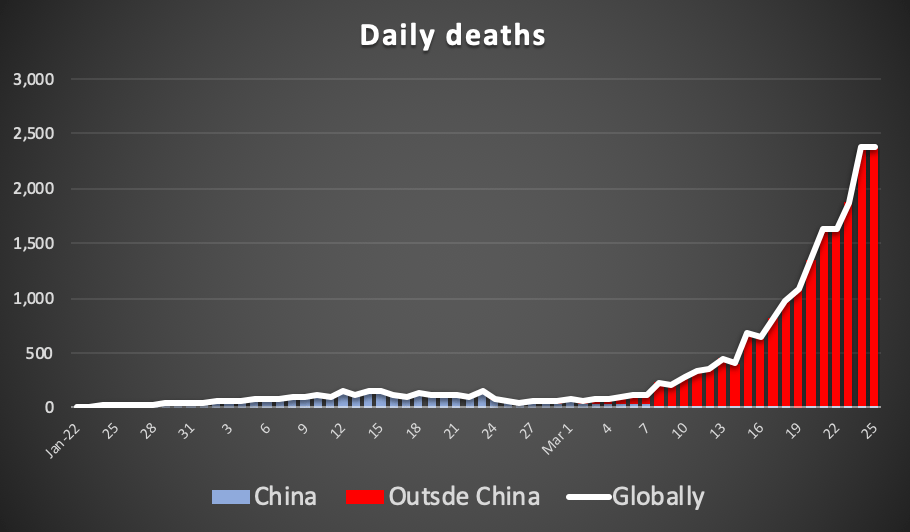 3. Jumlah kumulatif kematian di China melandai dalam sebulan terakhir, sebaliknya di luar China mengakselerasi dengan kecepatan tinggi.