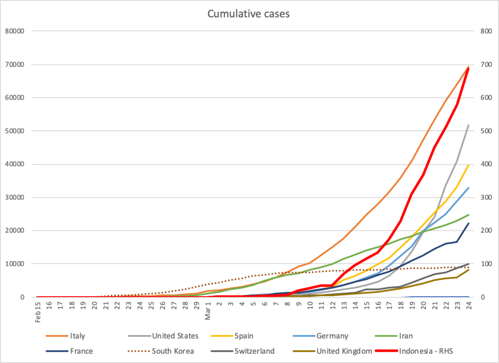 Prajurit dari berbagai jenjang kian banyak tewas. Sampai hari ini sudah 55 orang meninggal dunia. Untuk pertama kali, tambahan pasukan Indoenesia yang terjangkit menembus 100 orang hari ini, persisnya 107 orang. Tak ada tambahan satu pun yang pulih atau sembuh. Korban terjangkit coronavirus (confirmed cases) di Indonesia mencapai 686 orang, mendekati jumlah korban di beberapa negara Eropa yang sudah menjadi pusat pandemik seperti Yunani, Finlandia, Polandia, dan Luksemburg. Yang masih terbaring di rumah sakit (active cases) sebanyak 601 orang.
