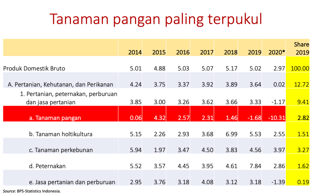 Pada triwulan I-2020, subsektor tanaman pangan mengalami kontraksi paling parah (10,3 persen) setelah subsektor transportasi udara (13,3 persen). Ditinjau dari peranannya terhadap produk domestik bruto (PDB), subsektor tanaman pangan lebih besar ketimbang subsektor transportasi udara, masing-masing 2,82 persen dan 1,63 persen pada tahun 2019.