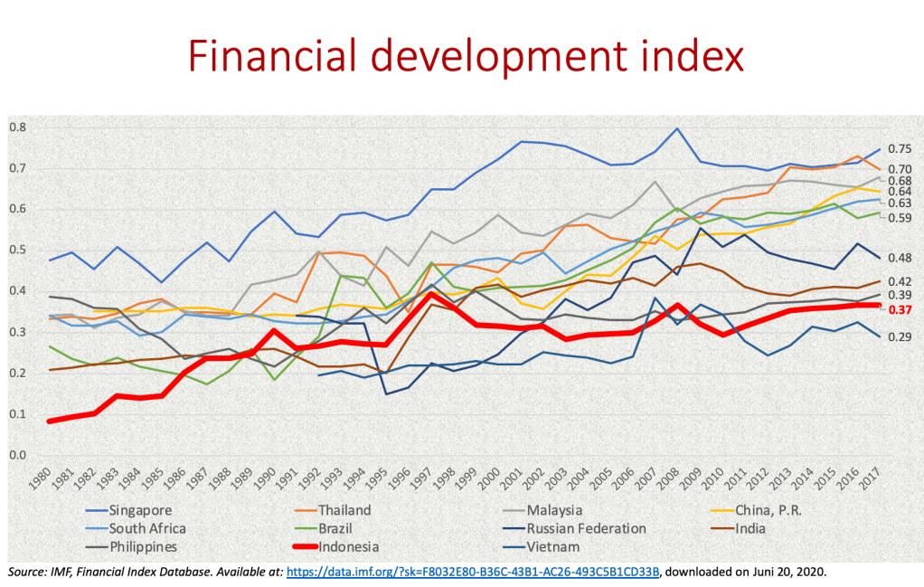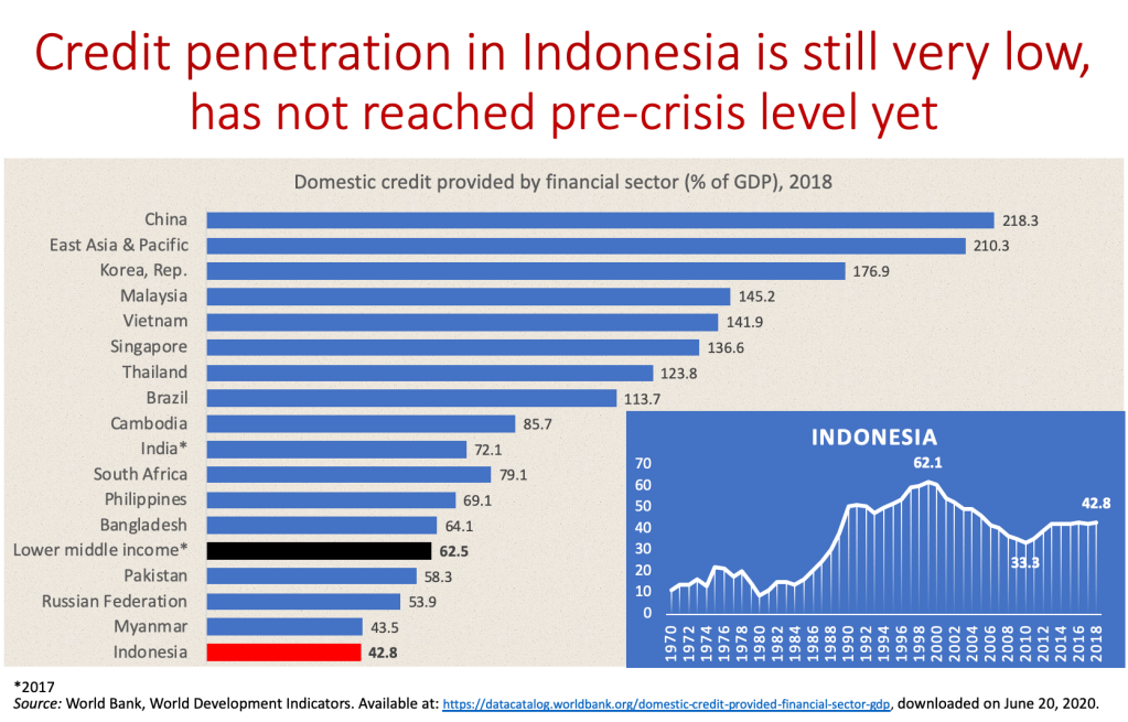 Kemampuan sektor keuangan dalam menyalurkan kredit tak sampai 50 persen dari PDB. Dengan Myanmar saja kita kalah. Jangan bandingkan dengan China dan rerata negara Asia Pasifik yang lima kali lipat dari Indonesia. Malaysia, Vietnam, Thailand, dan Brazil sekitar tiga sampai empat kali lipat dari Indonesia.