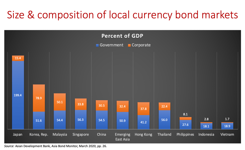 Kapasitas pasar modal Indonesia tak kalah tertinggal, terutama pasar obligasi. Pasar obligasi dalam mata uang lokal hanya sedikit lebih tinggi dari Vietnam. Bagaimana surat utang pemerintah bisa terserap oleh warganya sendiri untuk menutup defisit APBN?