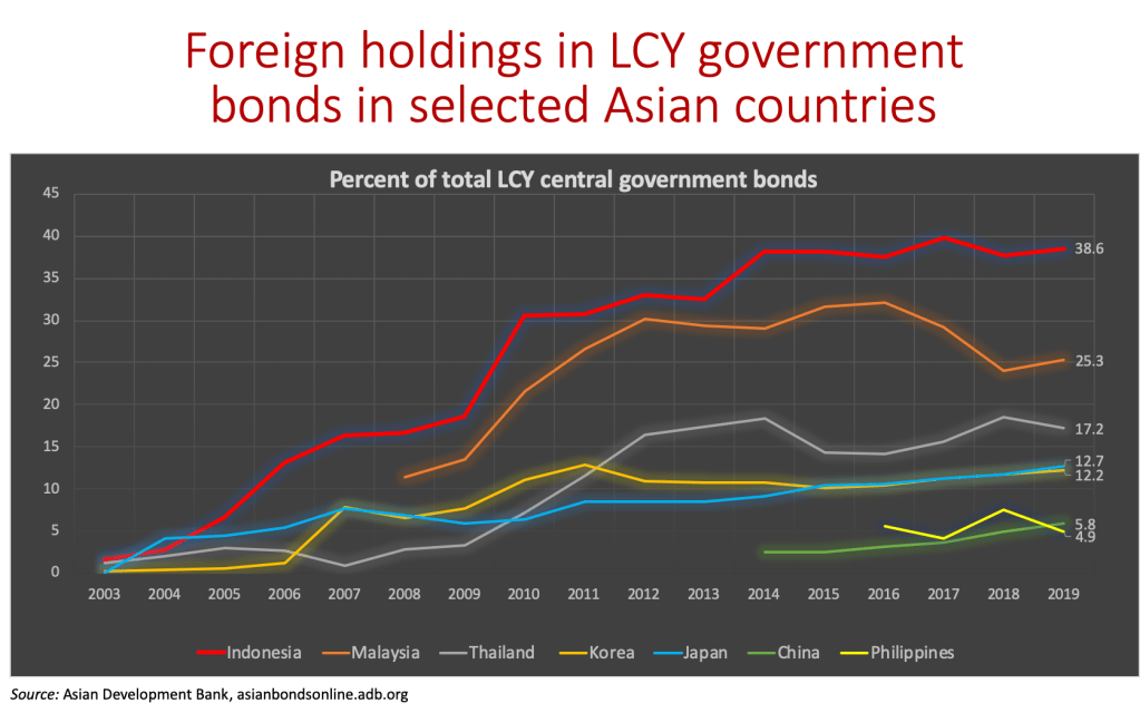 Maka terpaksalah menngundang lebih banyak investor asing. Pemilikan asing dalam obligasi negara dalam mata uang lokal di Indonesia tergolong sangat tinggi dan tertinggi di antara negara Emerging Markets.