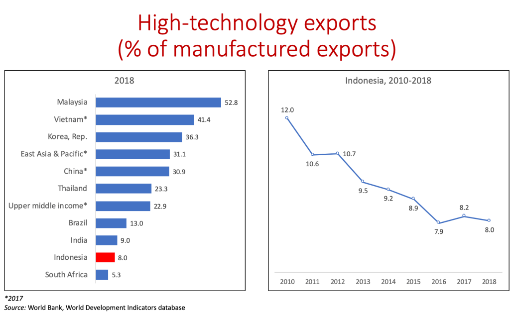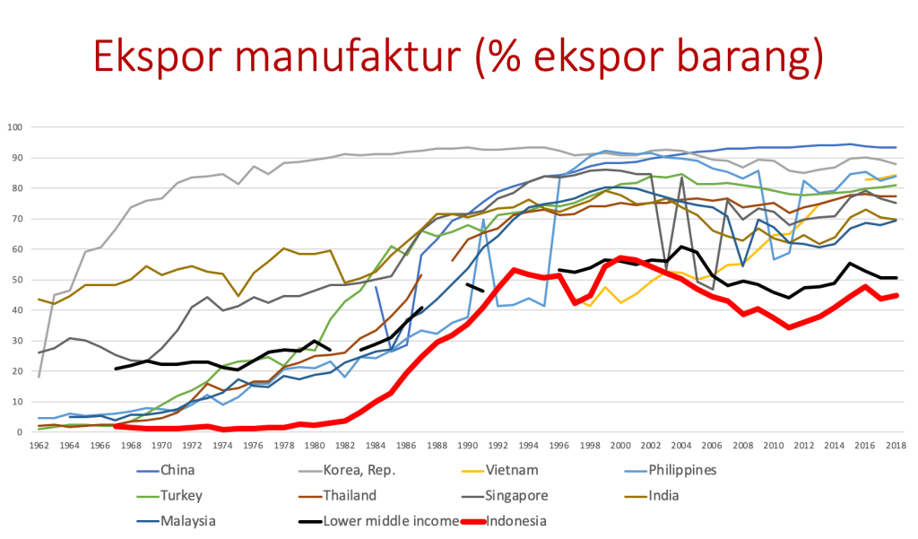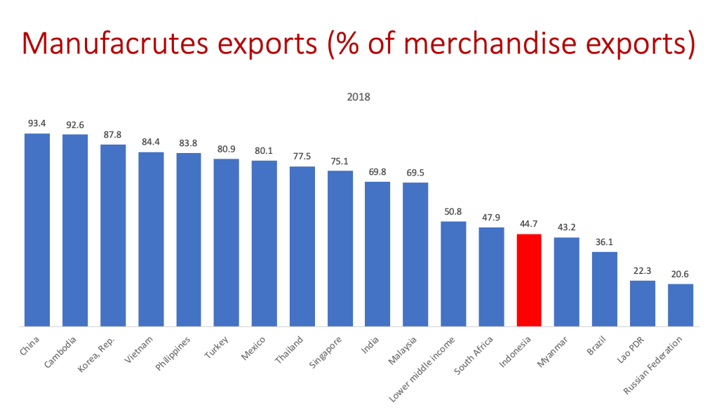 Ditambah lagi porsi ekspor manufaktur Indonesia relatif sangat rendah akibat terjadi gejala dini deindustrialisasi.