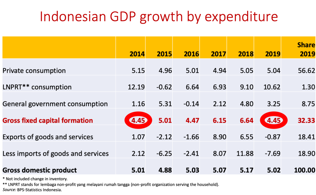 Investasi nyata-nyata bukan biang keladi dari pertumbuhan ekonomi yang melambat. Pertumbuhan investasi (diukur dengan pembentukan modal tetap domestik bruto/PMTDB) Indonesia lebih tinggi dibandingkan dengan banyak negara tetangga dan negara Emerging Markets seperti Malaysia, Afrika Selatan, Brazil, dan bahkan China sekalipun.