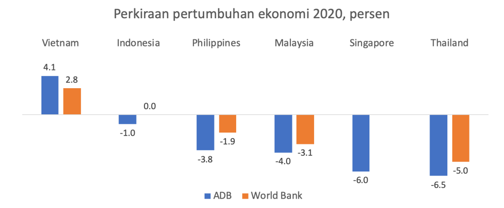 Beberapa negara tetangga dekat kita di ASEAN lebih terpukul ketimbang Indonesia. Malaysia dan Thailand, misalnya, diprediksi mengalami kontraksi karena peranan perdagangan luar negerinya relatif tinggi dan jauh lebih tinggi dari Indonesia tetapi jauh lebih rendah dari Singapura. Peranan ekspor dan impor di Malaysia masing-masing 65 peren dan 58 persen; sedangkan di Thailand 60 persen dan 51 persen. Vietnam, meskipun peranan ekspor dan impornya tiga digit (di atas 100 persen), diperkirakan terhindar dari resesi atau masih bisa tumbuh positif karena ditopang oleh investasi yang tidak anjlok tajam dan konsumsi rumah tangga serta konsumsi pemerintah yang masih tumbuh positif.
