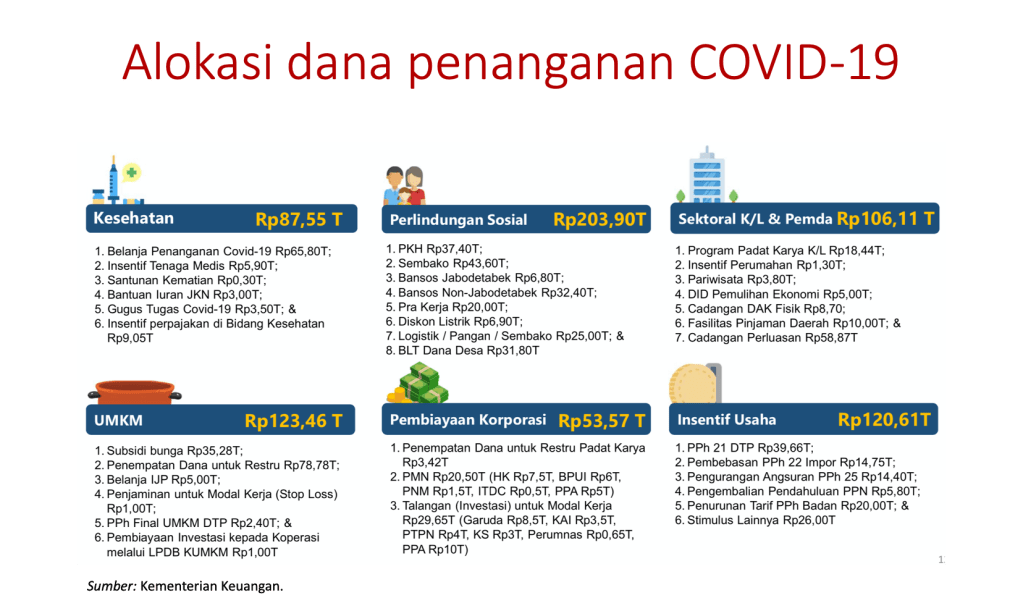 Jadi, tumpuan Indonesia agar terhindar dari krisis lebih dalam adalah belanja pemerintah dan menahan laju penurunan konsumsi rumah tangga yang merupakan penopang utama perekonomian dengan sumbangan dalam PDB sebesar 57 persen. Investasi yang merupakan penyumbang terbesar kedua tidak bisa diandalkan karena dunia usaha fokus mempertahankan produksi yang ada. Berbagai macam bantuan kepada masyarakat yang rentan dari dampak COVID-19 berupa bantuan langsung tunai, Program Keluarga Harapan (PKH) yang yang dinaikkan nilai bantuannya dan diperluas jumlah penerimanya serta paket bantuan lainnya sungguh sangat membantu menopang daya beli masyarakat.