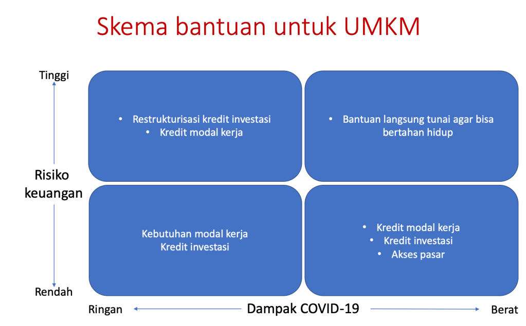 UMKM yang mengalami dampak berat akibat pandemik COVID-19 dan mengalami kesulitan atau risiko keuangan yang tinggi belum perlu dana restrukturisasi kredit. Yang mereka butuhkan adalah bertahan hidup. Oleh karena itu, yang mereka butuhkan adalah bantuan langsung tunai (BLT) untuk bertahan hidup sehari-hari.