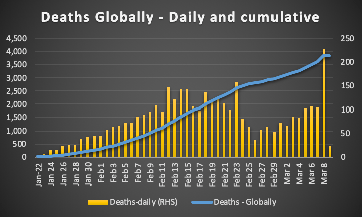 Senin (8/3) sejauh ini tercatat sebagai hari paling mematikan dengan jumlah 228 orang wafat. Rekor sebelumnya, 158 orang, terjadi pada 23 Februari.