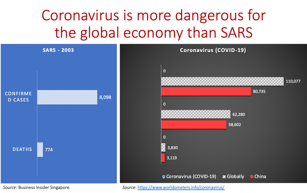 Coronavirus jauh lebih dahsyat dari SARS yang terjadi pada 2002-2003. Dampaknya terhadap perekonomian dunia juga demikian.