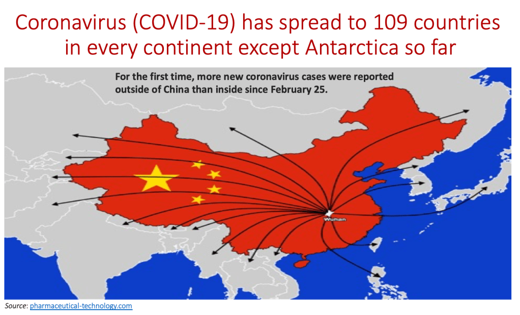 Kecepatan penularan kini telah bergeser dari China ke luar China. Lebih dari seperempat yang pernah dan masih terjangkit berada di luar China, terbanyak di Italia. Selain terbanyak, Italia juga menjadi negara yang tercepat penambahan penderitanya dan terbanyak jumlah kematiannya di luar China. Di Asia, Iran terbanyak merenggut nyawa dan tercepat penambahan korban tertular.