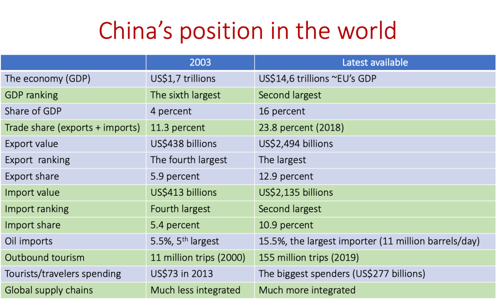 Perekonomian China dalam kancah dunia tahun 2003 belum seberapa. Sekarang China sudah menjelma sebagai kekuatan ekonomi terbesar kedua di dunia.