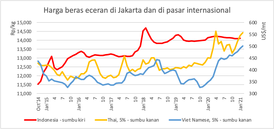 Harga beras di Indonesia juga lebih stabil dari harga beras di pasar internasional yang mengacu pada harga beras Thailand maupun Vietnam. Sejak akhir 2019 harga beras Vietnam meningkat tajam, dari US325,79/mt (setara dengan Rp4.724/kg) pada Oktober 2019 menjadi US$500,48/mt (Rp7.256/kg) pada Februari 2021, dengan kurs Rp14.500/US$. Ada pun beras Thailand naik dari US$421/mt (Rp6.105/kg) pada November 2019 menjadi US$557/mt (Rp8.077/kg) pada Februari 2021.