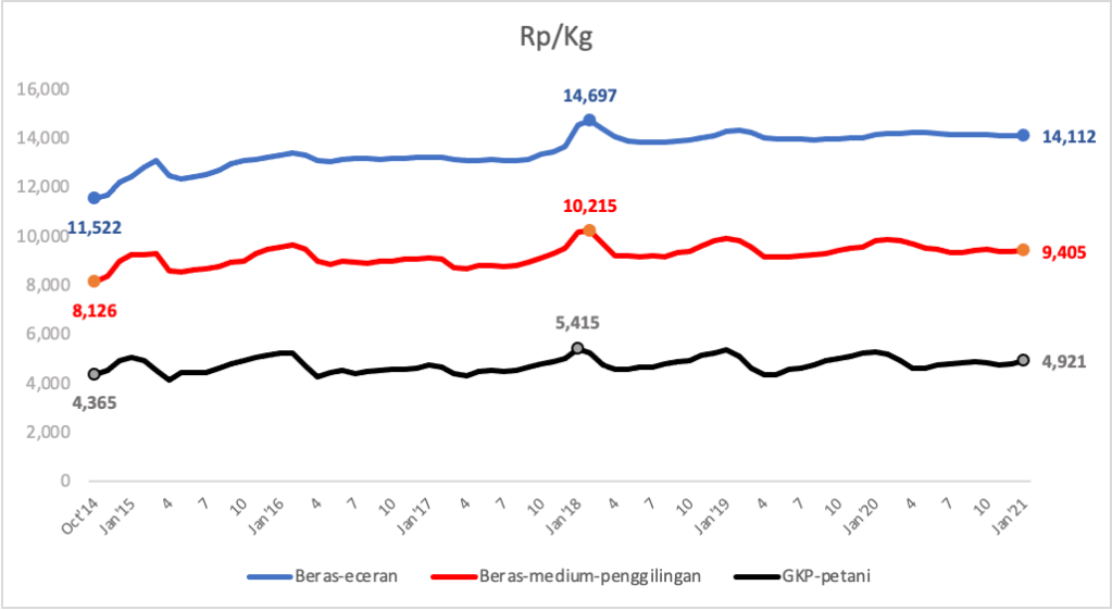 Sebelum pengumuman impor saja harga gabah di tingkat petani sudah cenderung tertekan. Sekalipun harga gabah kering panen (GKP) di tingkat petani pada Januari 2021 naik 3 persen dibandingkan Desember 2020, namun masih lebih rendah dibandingkan Januari tahun lalu (year-on-year) atau turun sebesar 6,7 persen. Untuk harga gabah kering giling (GKG) lebih parah lagi, yaitu turun 0,73 persen dibandingkan bulan sebelumnya (Desember 2020) dan turun tajam sebesar 8,28 persen dibandingkan Januari 2020.